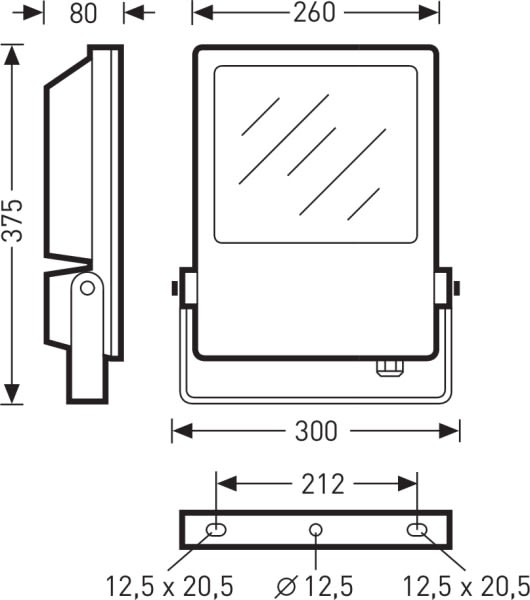 Projecteur LED pour illuminations et éclairage de surfaces. Réflecteur en aluminium avec surface à pouvoir réflecteur renforcé. À répartition semi-extensive asymétrique des intensités lumineuses. Flux lumineux du luminaire et couleur de la lumière fixes. Flux lumineux du luminaire 12000 lm, puissance raccordée 86 W, rendement lumineux maximale du luminaire 140 lm/W. Teinte de lumière blanc neutre, température de couleur (CCT) 4000 K, indice général de rendu des couleurs (IRC) Ra > 70. Tolérance de localisation chromatique (initialement MacAdam) ≤ 4 SDCM. Durée de vie assignée moyenne L80(tq 25 °C) = 50.000 h. La source lumineuse est remplaçable conformément aux exigences d'écoconception (Règlement (UE) 2019/2020). Boîtier du projecteur en aluminium moulé sous pression. Surface revêtue de noir (RAL 9005). Dimensions (L x l): 80 mm x 300 mm, hauteur du luminaire 375 mm. Verre de fermeture en verre de sécurité simple Classe électrique (EN 61140) : I, indice de protection (norme EN 60529) : IP65, degré de résistance aux chocs selon la norme CEI 62262 : IK09. Surface exposée au vent Fw . Poids: 4.6 kg. Avec appareillage électronique, commutable Résistance aux pics de tension Mode différentiel / mode commun : 2 kV / 5 kV. Le produit répond aux exigences essentielles des directives européennes applicables et de la loi sur la sécurité des produits et porte le marquage CE.
