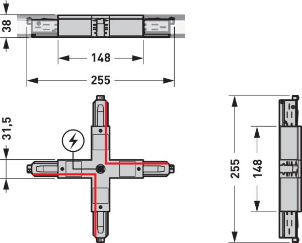 Connecteur en X pour quatre segments de rail conducteur triphasés avec équipement DALI. Avec possibilité d’alimentation. Convient aux rails conducteurs encastrés et en saillie. À utiliser en combinaison avec système de rails conducteurs triphasé (DALI) - Rail.. Position de la polarité, voir le marquage rouge sur le schéma coté. Couleur noir (similaire à RAL 9005). Dimensions (L x l x H) : 255 mm x 255 mm x 38 mm. Position de la polarité, voir le marquage rouge sur le schéma coté.